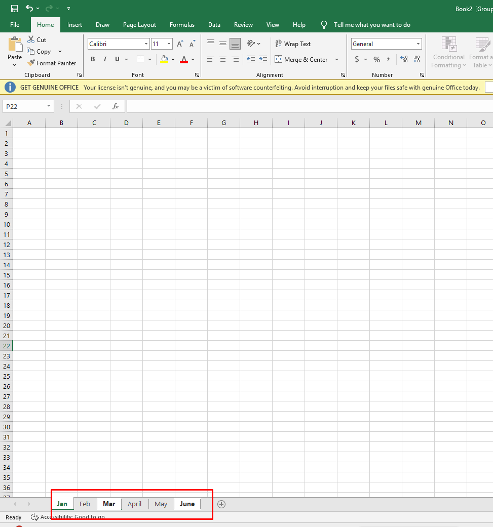 Once you click the last sheet tab, all the sheets between the first and the last one will be selected.